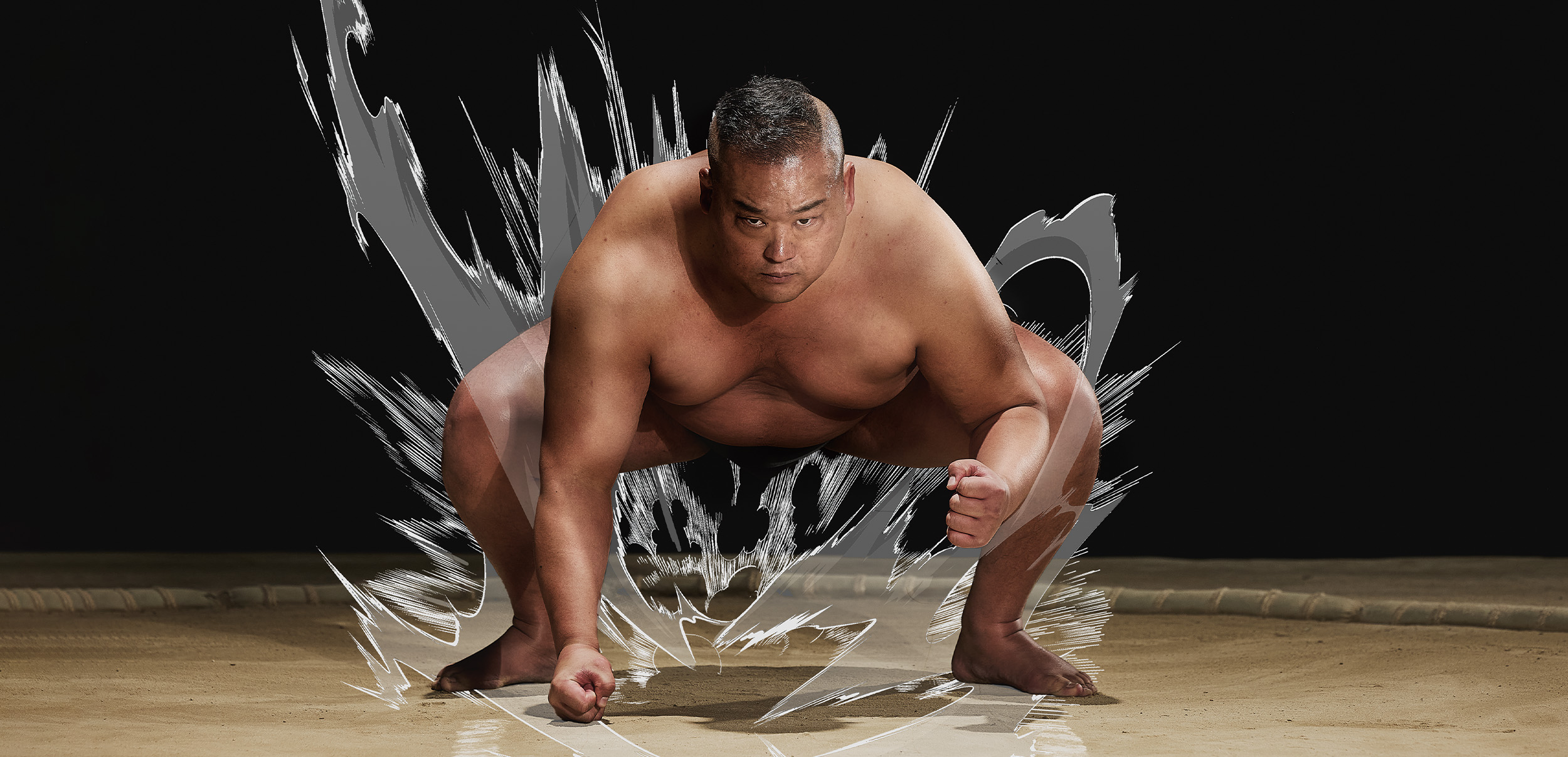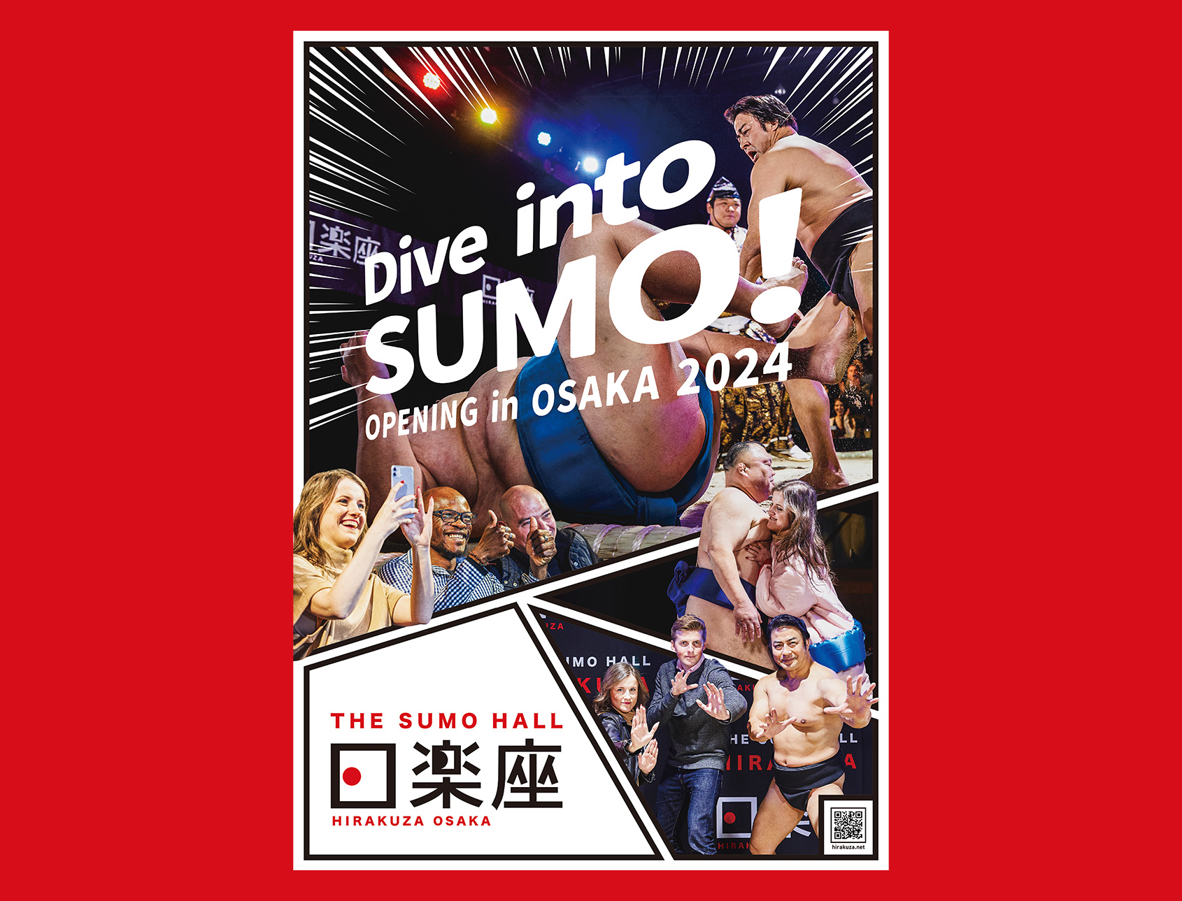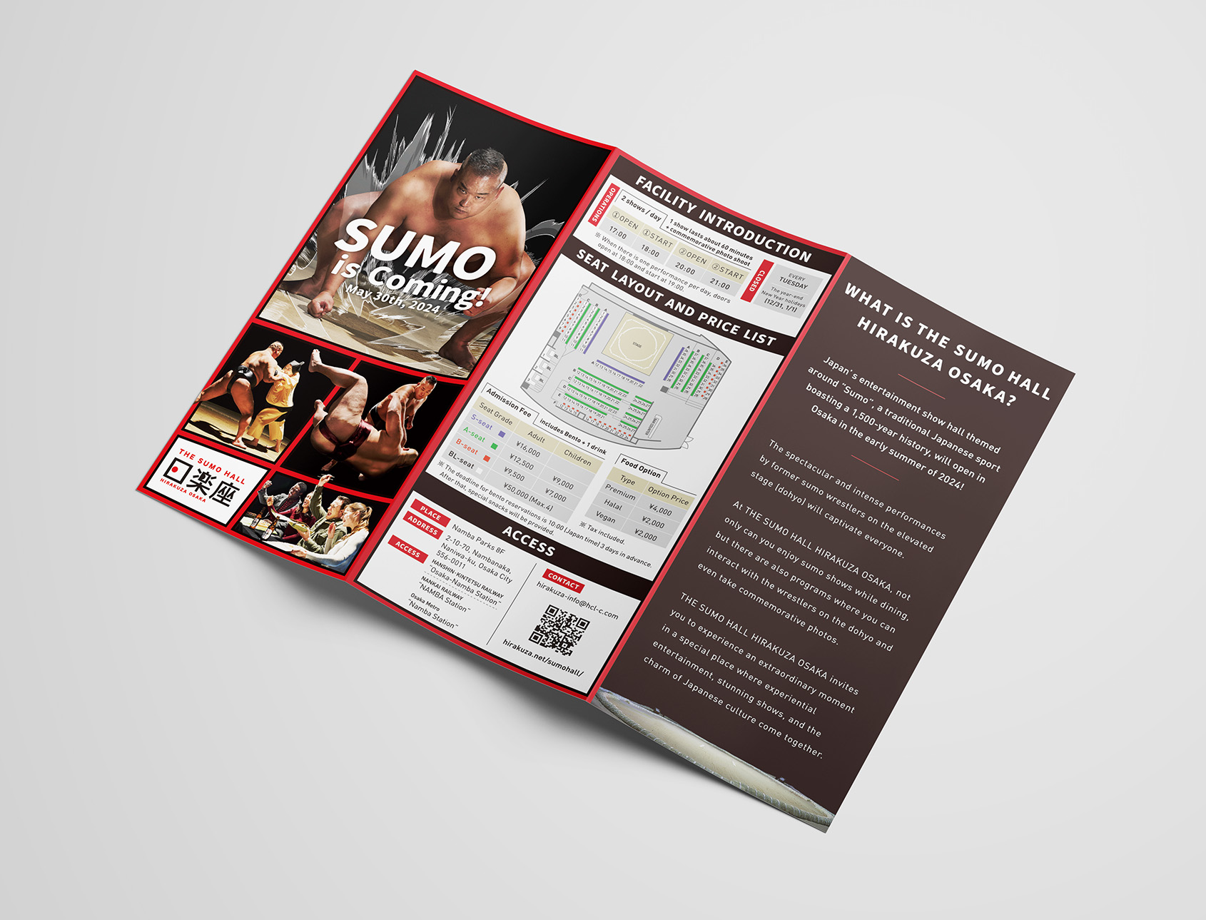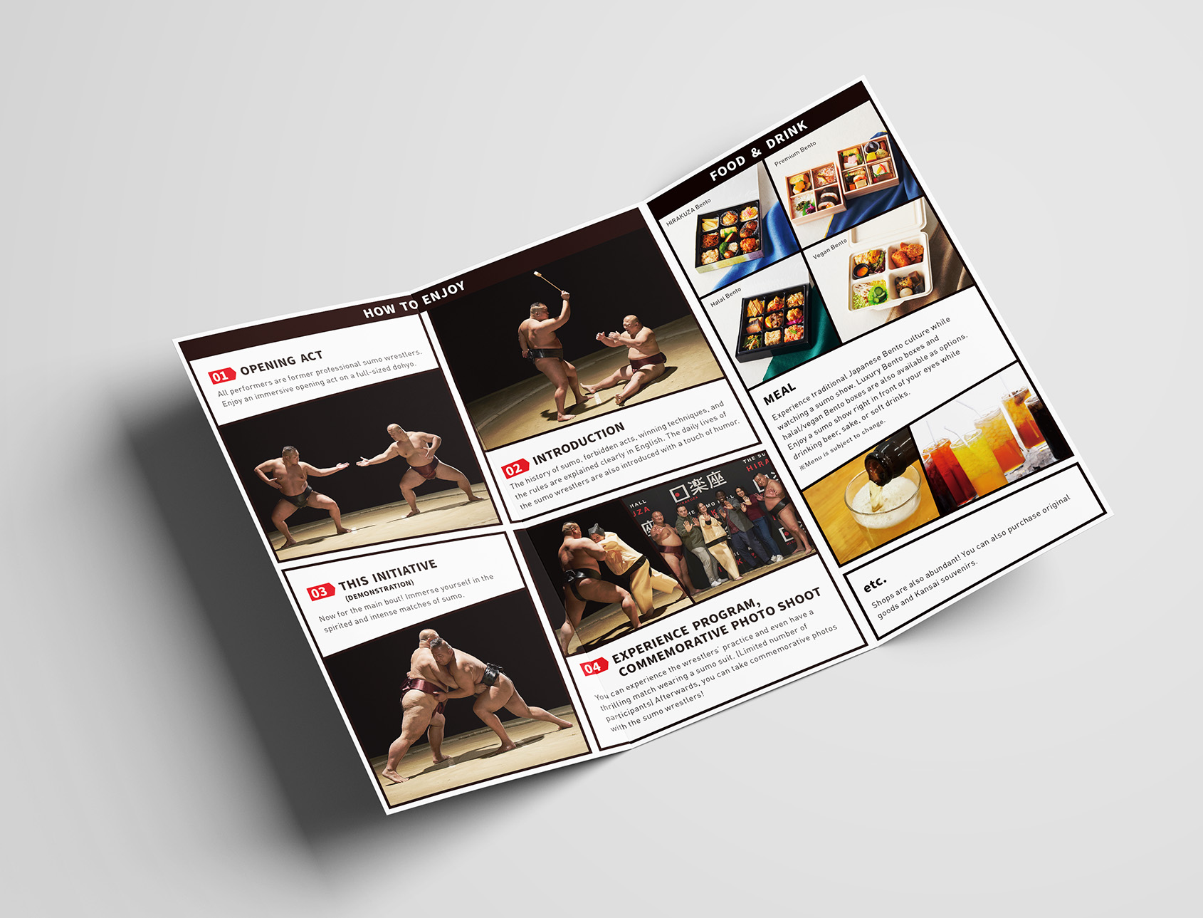2024年にオープンした外国人観光客向けの相撲エンターテイメント「日楽座」のキービジュアルとパンフレットの制作を担当。漫画のコマ割りや必殺技のようなエフェクトを取り入れ、ティザービジュアルと本番ビジュアルに共通するコンセプトでデザインを展開しました。