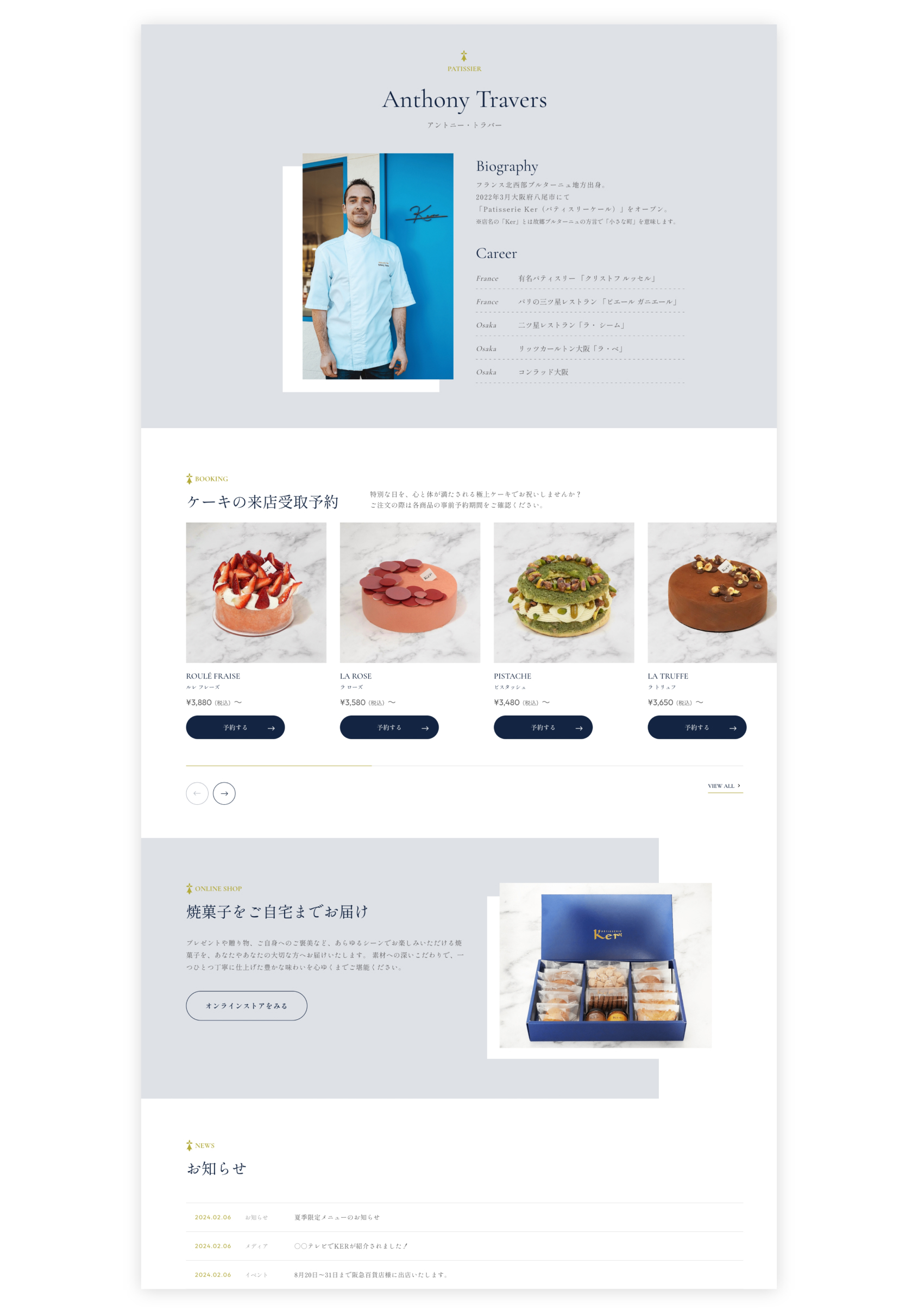 フランス出身のシェフが営むPatisserie KerのWebサイトを制作。オンラインでホールケーキの予約と決済ができるプラグインを搭載したオリジナルのWordPressテーマを作成。企画から設計、デザイン、WordPress化まですべて担当。