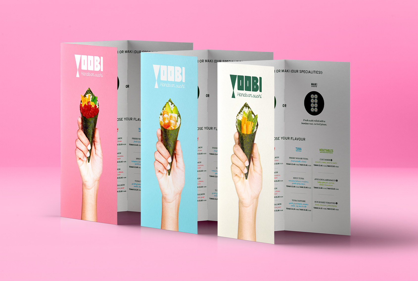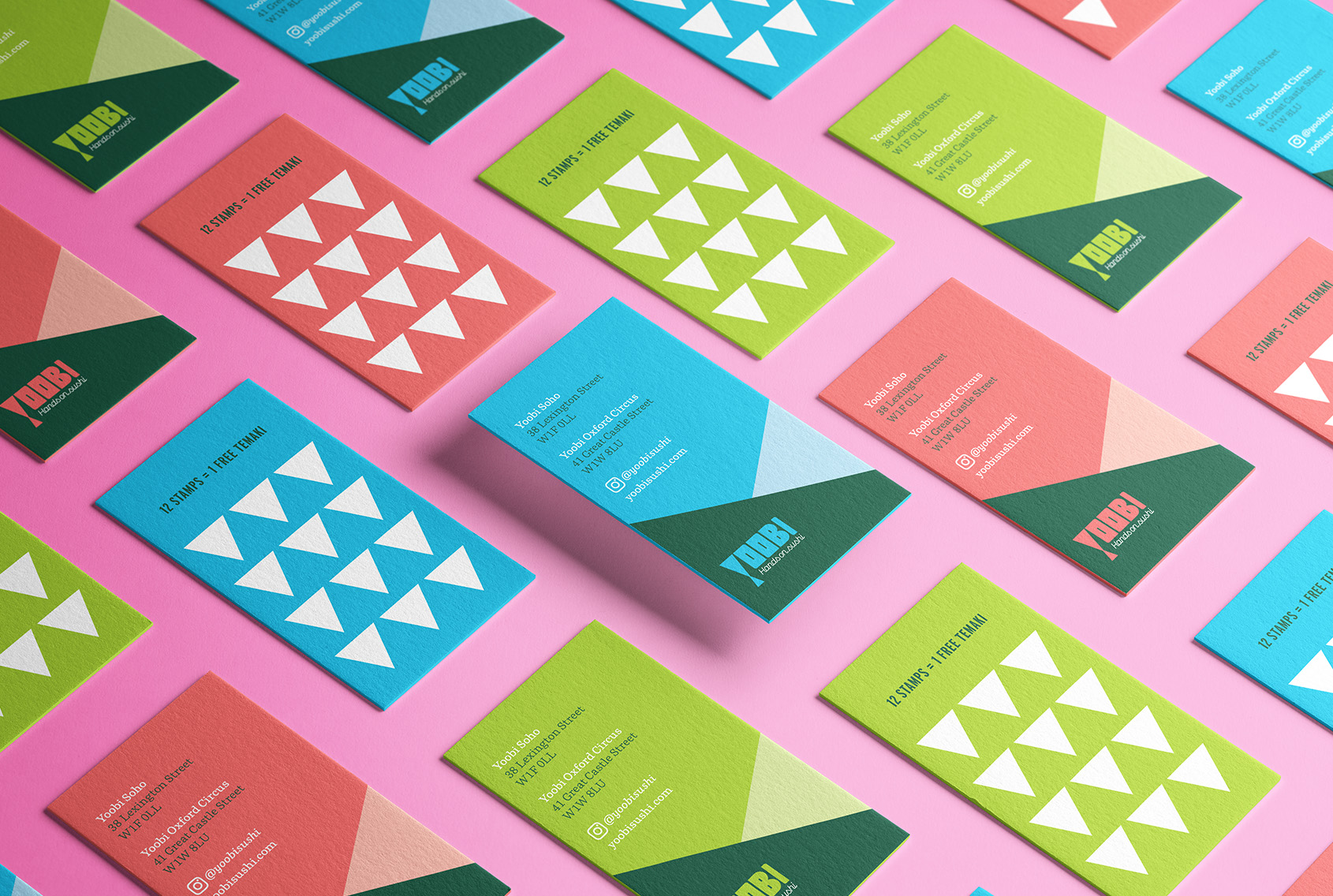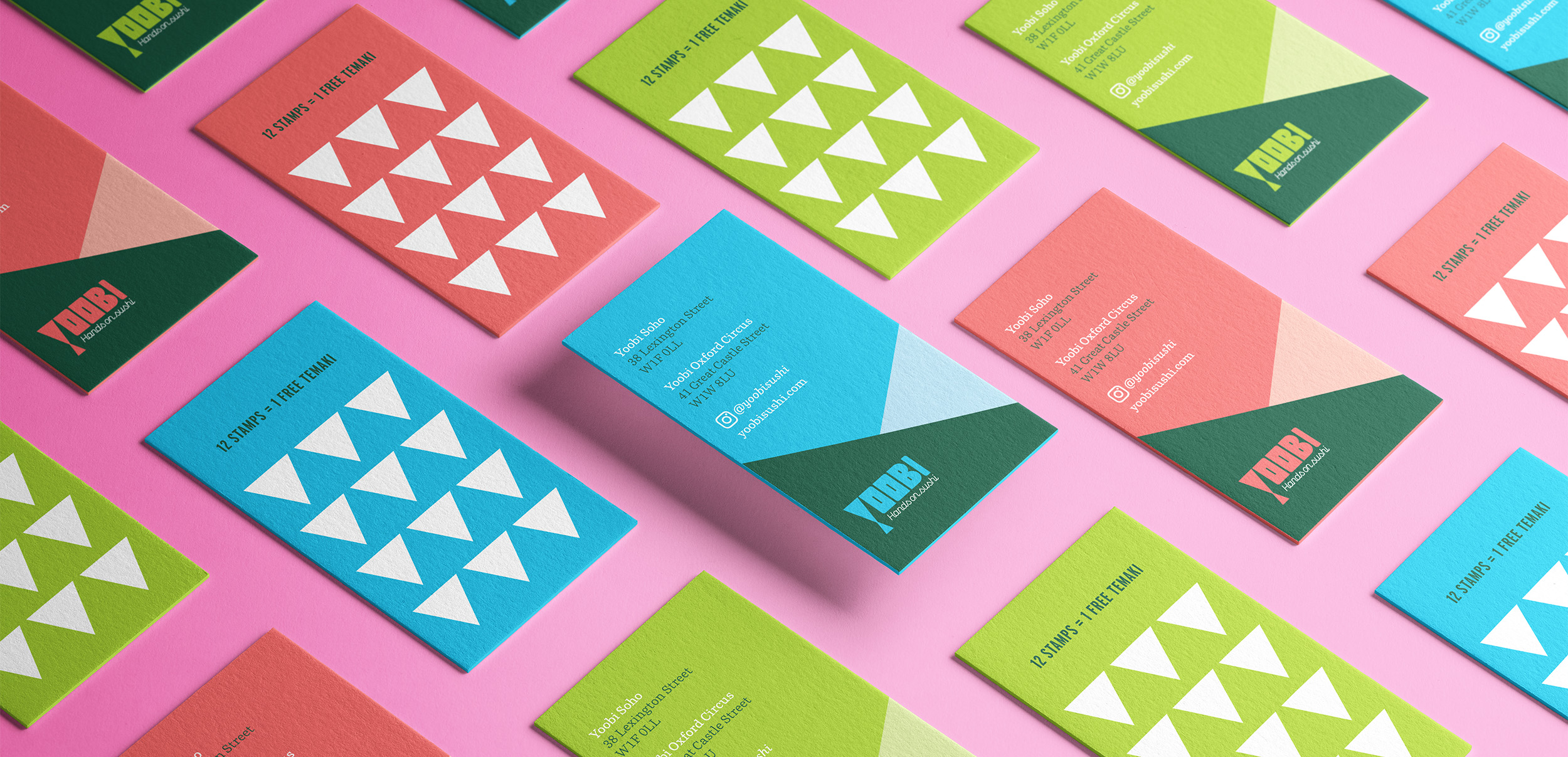 手巻き寿司に馴染みのないゲストが店内でスムーズにオーダーできるよう、アイコンを使って分かりやすくデザインしたメニューを制作。また、フードとドリンクをまとめたコンパクトなテイクアウトメニューや、手巻き寿司の三角形をヒントにしたショップカード兼スタンプカードもデザインしました。