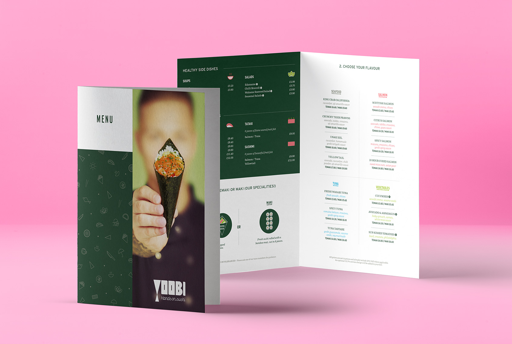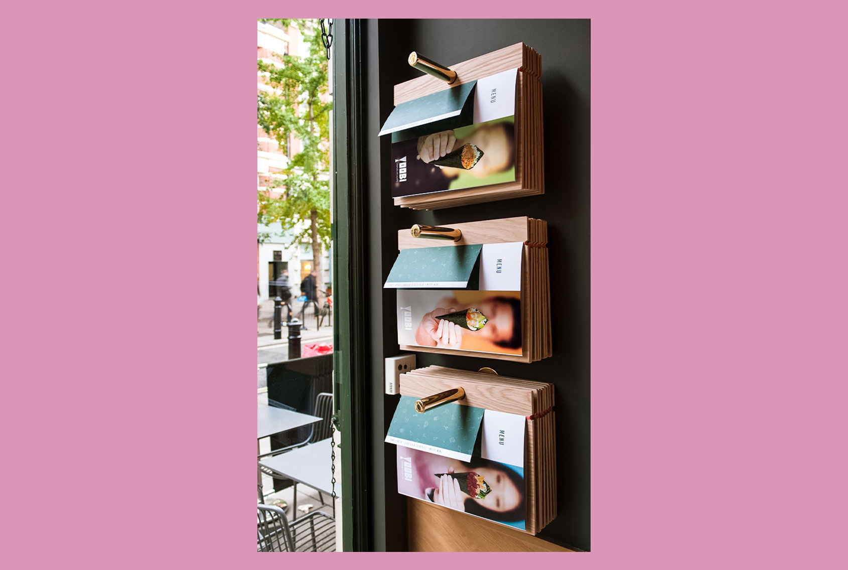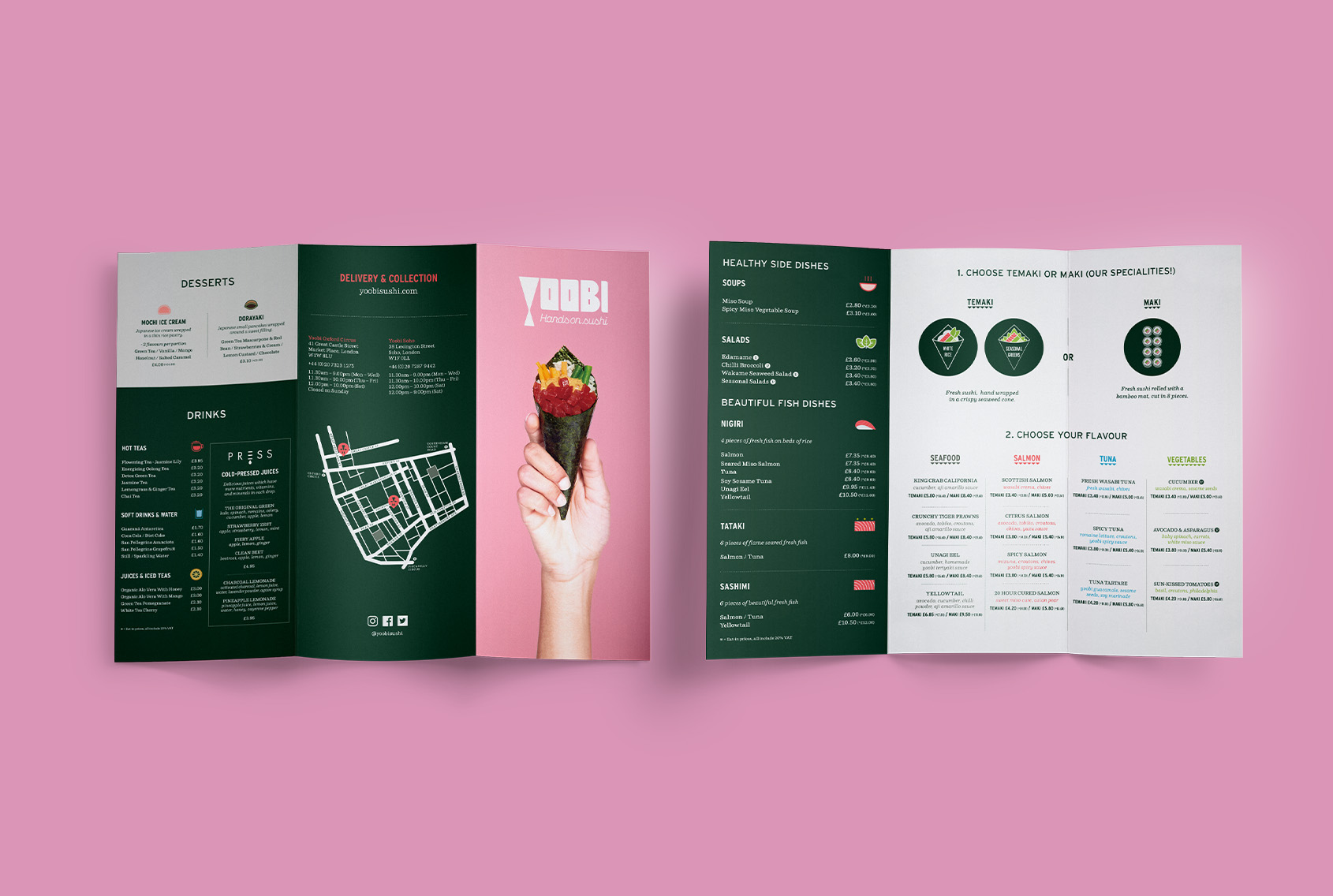 手巻き寿司に馴染みのないゲストが店内でスムーズにオーダーできるよう、アイコンを使って分かりやすくデザインしたメニューを制作。また、フードとドリンクをまとめたコンパクトなテイクアウトメニューや、手巻き寿司の三角形をヒントにしたショップカード兼スタンプカードもデザインしました。
